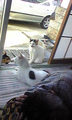 手前から、パパン、にゃんこたち(あん、めぐ、こみ)と、車です。