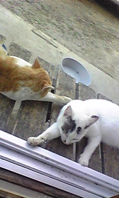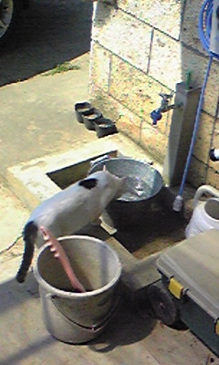 画像は、暑さでギブ中のちゃろとあん。水を飲むあん。